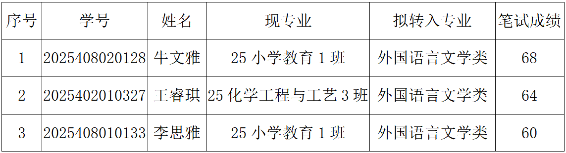 外国语学院2025年秋季学期期末转专业面试定于2025年12月25日(星期四)下午3:00在A3203教室举行,请以上学生按时参加面试。